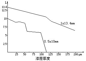 由图2可见,深度大的缺陷能在较厚的漆层情况下仍有清楚显示(长度变短,不过本实验中人工刻槽的深度不均匀也是影响因素之一),深度浅的缺陷在一定漆层厚度时就已经无法显示出来了。