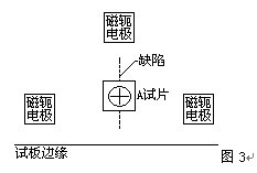 为了便于用千分尺测量漆层厚度,受千分尺结构尺寸所限,缺陷刻制在试板近边缘部分,因此所使用的四极旋转磁场电磁轭只能用上三只磁极,第四极悬空。